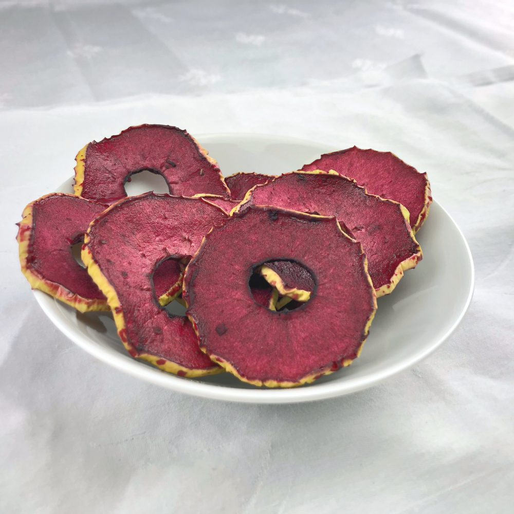 Les tranches de pomme sont simplement trempées dans un jus de Cassis avant de passer au déshydrateur. En plus de la magnifique couleur que leur procure le cassis, les pommes séchées au cassis vont vous surprendre en bouche avec ce mariage de saveurs acidulées.